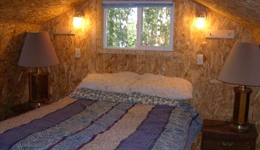 This cabin comes with running water and a Hot tub near by for your use. It is small 12x16 with a upstairs Queen and Single Bed. Main Floor has 2 Futons to sit and watch the Lake and a nice size Deck!